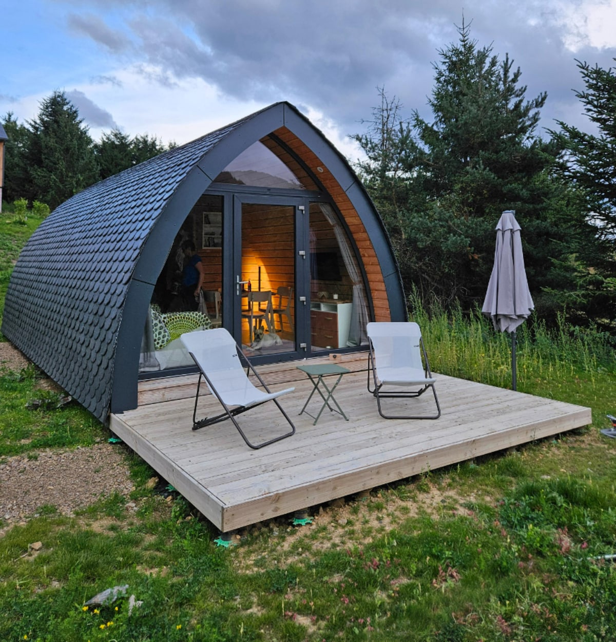 Antoine’s Cabin is a bright wooden retreat with a large picture window overlooking the breathtaking view of Mont Lozère. The cozy living area includes a fully equipped kitchenette, a dining space, a sofa and a Smart TV. The two bedrooms feature a double bed (140 cm) and two single beds (80 cm). You’ll enjoy a comfortable bathroom and separate toilet. The private terrace facing nature is perfect for a peaceful and revitalizing stay.