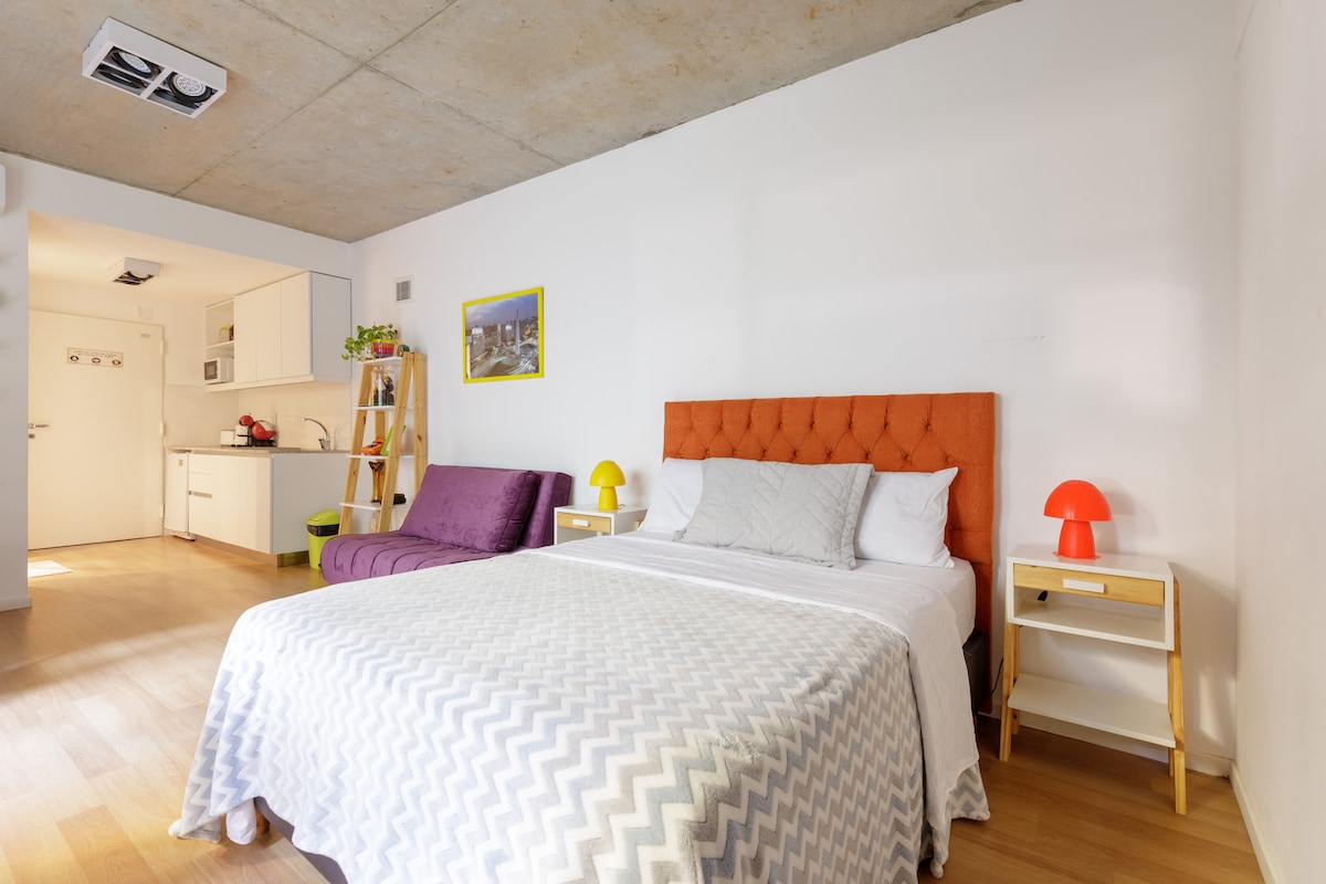 Accogliente monolocale a Palermo, con balcone privato e vista su viale alberato. Completamente attrezzata con tutto il necessario per un confortevole soggiorno. Dispone di un letto queen-size, una cucina completamente attrezzata per due persone, TV con piattaforme di streaming attive, Wi-Fi ad alta velocità, biancheria da letto e da bagno pulite e una lavatrice in loco. Situato in una delle zone più comode e ambite della città, circondato da un'ampia scelta di ristoranti e negozi, dalla Movistar Arena e da ottimi collegamenti con i mezzi pubblici.
