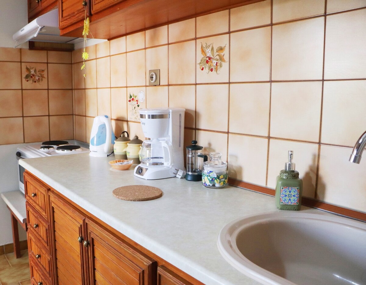 Una bella atmosfera estiva per questo spazioso appartamento con giardino. 1 camera matrimoniale, zona giorno a pianta aperta, ampia cucina . Vicino alle colline di Meteora con vista panoramica sulla città e sulle rocce. Situato in un luogo tranquillo e silenzioso. Un sacco di finestre e la luce naturale del sole ~ goditi il panorama o fai una breve passeggiata fino al leggendario sentiero escursionistico Holly Trinity. Siamo a 15 minuti a piedi dal centro della città e a 15 minuti a piedi dal tempio antico della Vergine Maria.