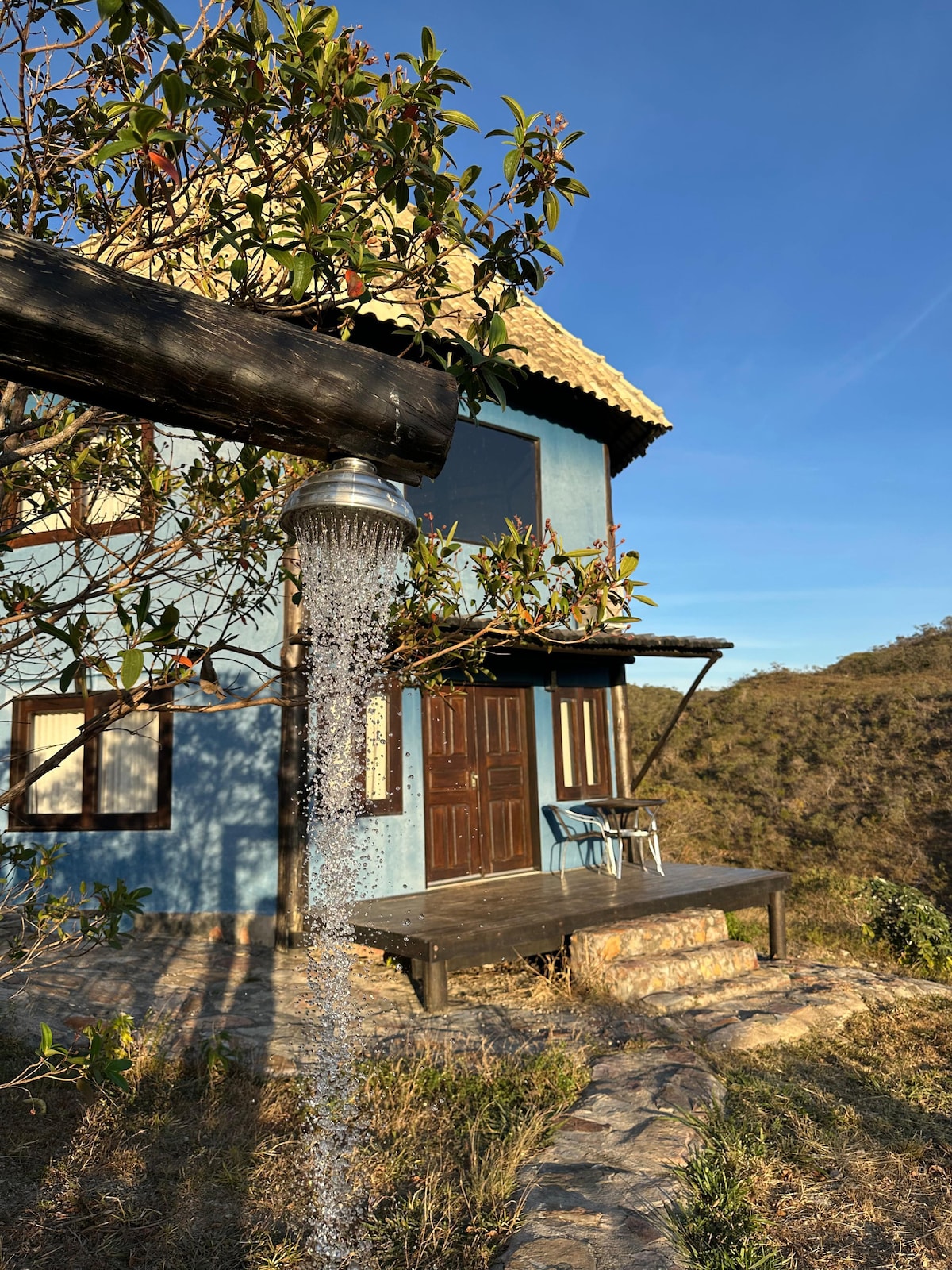 Con una splendida vista sulla valle e sulle montagne e un'area di contemplazione con vasca idromassaggio privata e piscina in comune, la Cabana Pouso Alto si ispira all'architettura tipica della regione di Chapada dos Veadeiros. Costruita con pareti di mattoni ecologici di adobe, struttura di eucalipto di riforestazione e pavimento di cemento cotto, offre ai suoi visitatori la vera esperienza di vivere e sentire la vita come è nel mezzo del cerrado. Piscina condivisa