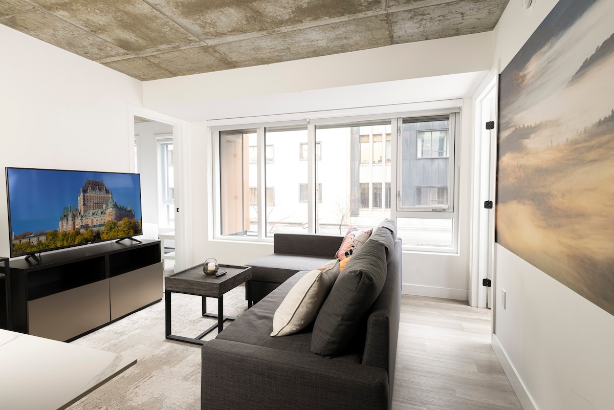 Appartamento ultramoderno con 2 camere da letto e 2 bagni completi che possono ospitare comodamente 4 viaggiatori! Venite a vivere la capitale nazionale. A pochi minuti a piedi dalla vecchia Québec Parcheggio interno gratuito a 2 minuti a piedi. Godetevi il sole con la piscina, la terrazza o i barbecue sul tetto, un'esclusività del quartiere! (Nella stagione estiva) Schermo da 60 pollici, Netflix & Disney+ Cucina completamente attrezzata (pentole, set per fonduta, taglieri, spezie, ecc.) CITQ 310477