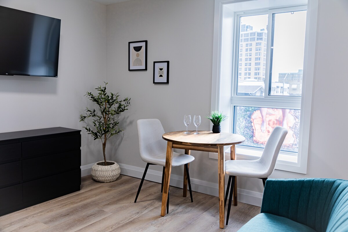 Benvenuti alla vostra fuga tra le nuvole. Situato al 21° piano nel cuore di Kitchener Waterloo. Questo elegante appartamento con 1 camera da letto offre una vista mozzafiato, un comodo letto matrimoniale e una cucina completa con elettrodomestici all'avanguardia. I servizi dell'edificio includono una palestra, una piscina, una zona lounge e una terrazza con barbecue. Che tu sia qui per lavoro o per divertimento, ti sentirai come a casa tua.