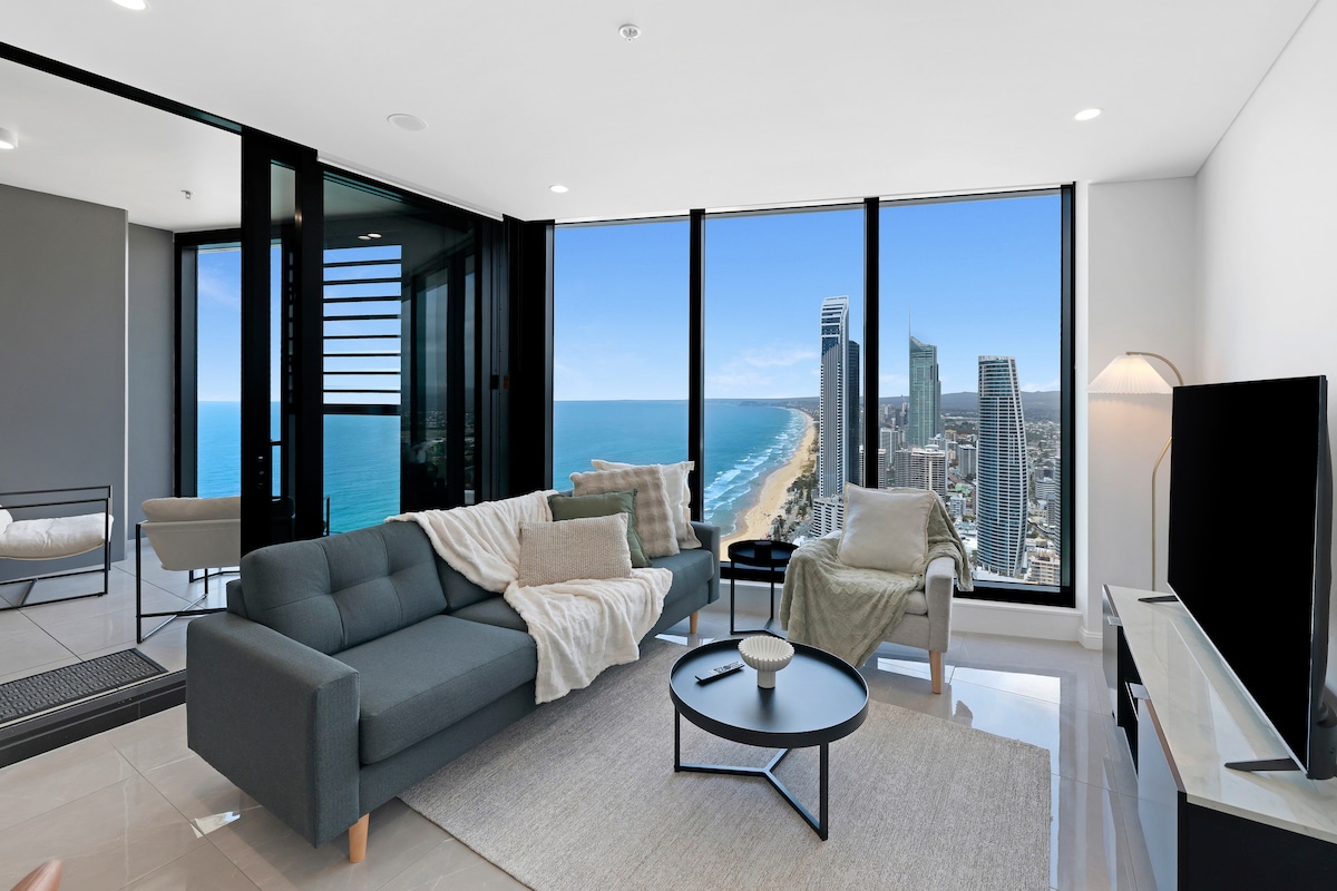 Appartamento 🌊 Meriton Ocean View | 2 camere da letto 1 bagno Soggiorna in alto sopra la Gold Coast in questo moderno appartamento di Meriton con vista mozzafiato. La camera da letto principale offre una vista sullo skyline, sul fiume e sulle montagne, mentre la seconda camera da letto offre una splendida vista sull'oceano. Goditi bagni eleganti, soggiorno open space con cucina completa e balcone privato per il caffè del mattino o i drink della sera. A pochi passi da spiaggia, metropolitana leggera, negozi e ristoranti.