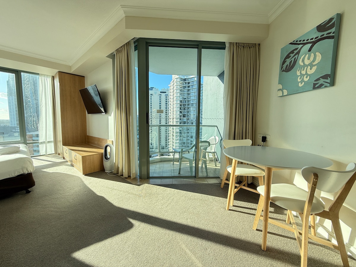 Benvenuti nel vostro rifugio all'ultimo piano nel cuore di Surfers Paradise. Questa elegante suite monolocale si trova al 22° piano del Mantra on View, con viste mozzafiato sull'oceano, sul fiume, sulle montagne e sullo skyline della città. A soli 100 metri dalla spiaggia, è ideale per colleghi in viaggio di lavoro, amici in cerca di avventura o famiglie che cercano una vacanza in stile hotel, con un tocco di fascino in più. Internet Wi-Fi gratuito e accesso GRATUITO a Netflix inclusi.