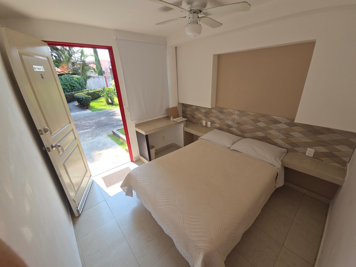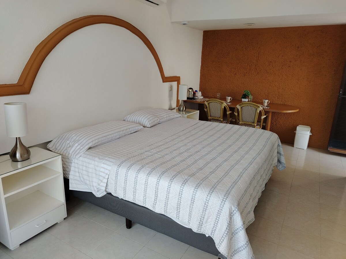 Rilassati in questa vacanza unica e tranquilla. Nella nostra suite godrai di un soggiorno confortevole e piacevole, progettato con cura per te. Potrai riposare in uno spazio fresco con aria condizionata, acqua calda nella doccia, zona lavoro, spazio lettura, TV con Netflix, godendo del vantaggio di un ingresso indipendente con parcheggio privato. Ti sentirai al sicuro accompagnato dalla nostra famiglia nella casa principale e con sorveglianza 24 ore su 24.