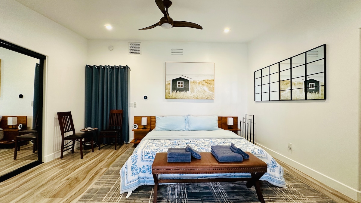 La camera ha un ingresso privato. Si trova in una zona residenziale di Ocean Beach, a 5 isolati dalla spiaggia e dal molo di Ocean Beach e a 2 isolati dalla vita del villaggio, dai negozi e dai ristoranti. Dispone di letto matrimoniale, piccolo bagno privato con doccia, frigorifero, TV, wifi, forno a microonde e così via. Gli ospiti apprezzeranno la posizione e la privacy! Sedie a sdraio, asciugamani, ombrelloni e altro ancora sono disponibili per il tuo divertimento. Goditi la splendida vista sull'oceano dal cortile.