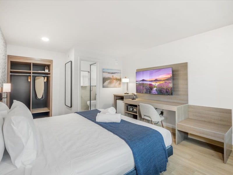 Scopri comfort e comodità in questa elegante camera d'hotel di San Francisco con letto matrimoniale grande, Smart TV e zona lavoro dedicata. Rilassati con tocchi premurosi come un armadio spazioso, uno specchio a figura intera e un bagno moderno fornito di soffici asciugamani di alta qualità. Su richiesta è possibile usufruire di un parcheggio a pagamento. Perfettamente situato vicino a affascinanti parchi, negozi e ristoranti locali, questo spazio invitante è l'ideale sia per lavoro che per rilassarsi durante il soggiorno in città.