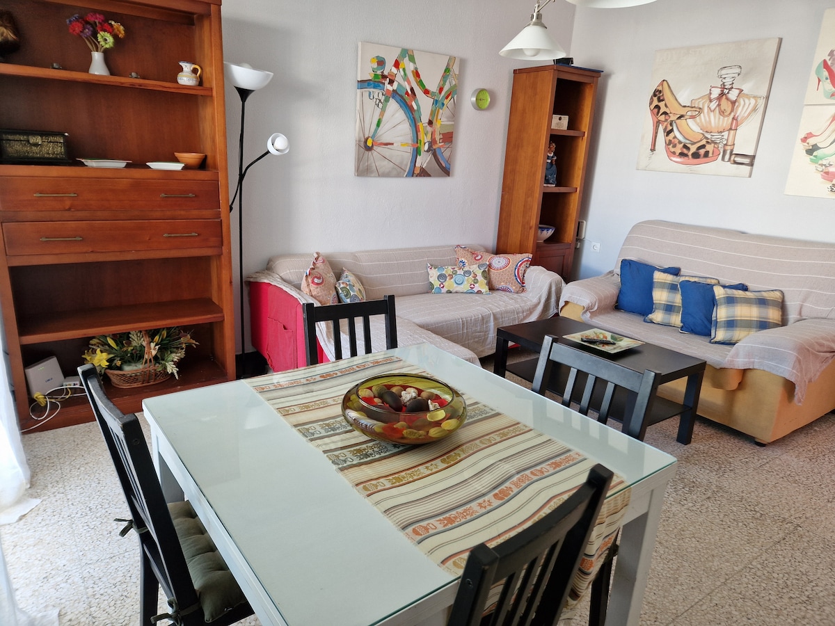 Grazioso e accogliente appartamento al primo piano con ampio patio condiviso con un altro appartamento. Zona tranquilla. Si compone di una camera da letto con letto matrimoniale e divano letto nel soggiorno (entrambi con aria condizionata e ventilatore). Bagno e cucina (forno a microonde, tostapane e articoli necessari). Situato a 7 minuti (550 m) dalla Rule Beach A 600 metri dal centro. Circondato da tutti i tipi di servizi nel raggio di 200 m (bar, negozi, ecc.). WIFI GRATUITO. L'ARIA VIENE PAGATA SEPARATAMENTE