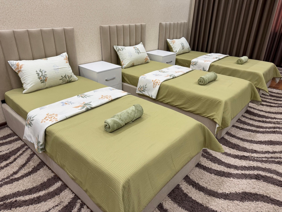 Benvenuto nel tuo tranquillo rifugio a Khujand! Questo appartamento al piano terra con 3 camere da letto, recentemente ristrutturato, è luminoso, spazioso e progettato per il comfort. Situato in una zona tranquilla e verde a soli 3 minuti da un supermercato. Può ospitare fino a 6 persone: 1 letto king-size, 2 letti singoli e un divano letto. Goditi una cucina completamente attrezzata, un bagno completo, servizi igienici separati, parcheggio gratuito in loco, Wi-Fi ad alta velocità e aria condizionata. Ideale per famiglie o gruppi che cercano relax e comodità nel cuore di Khujand.