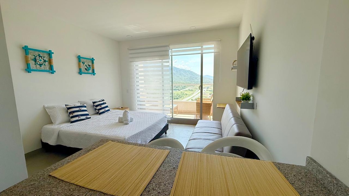 Goditi un nuovo appartamento fronte oceano con accesso alla spiaggia e alla piscina, a soli 5 minuti dall'aeroporto. Ideale per coppie o viaggiatori singoli, dispone di un comodo letto matrimoniale e di un letto estraibile aggiuntivo. L'appartamento può ospitare 3 persone, con possibilità di aggiungere un 4° ospite su un materasso a un costo aggiuntivo. Accedi al beach club con un ristorante locale, vasche idromassaggio e un'atmosfera perfetta per riposare. La tua vacanza ideale a Santa Marta! Siamo accanto all'Hotel Decameron.