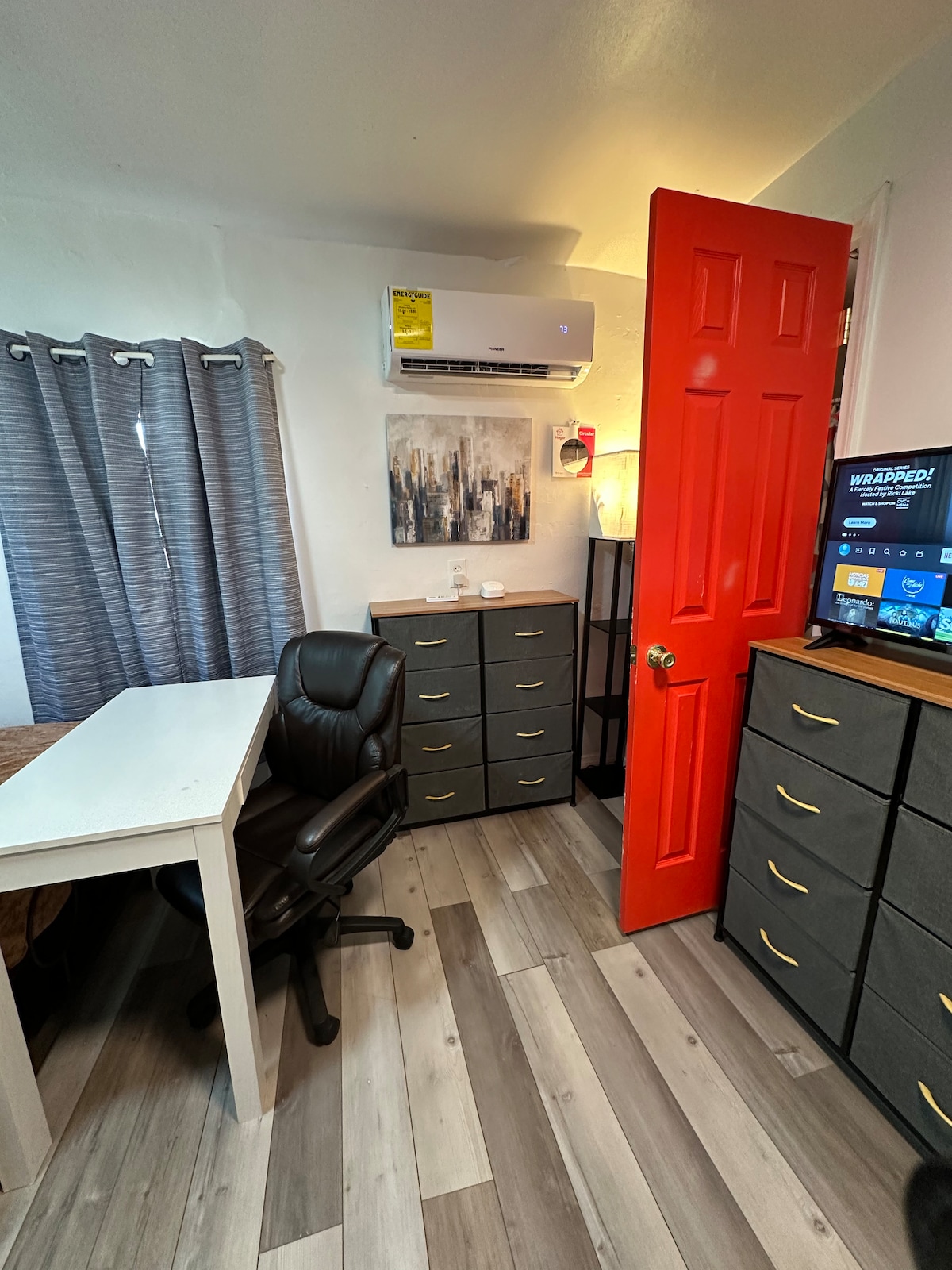 "The Apartment" es un espacio anexo en una casa en fraccionamiento privado, equipado con todo lo necesario, una gran recamara con cama matrimonial con entrada de luz natural pero no incandescente, perfecta para descansar y ver peliculas en la Smart Tv, tiene su baño privado y un closet vestidor, tambien esta su area para trabajar o disfrutar de una cena, The Department es muy acojedor y perfecto para cualquier ocasión.