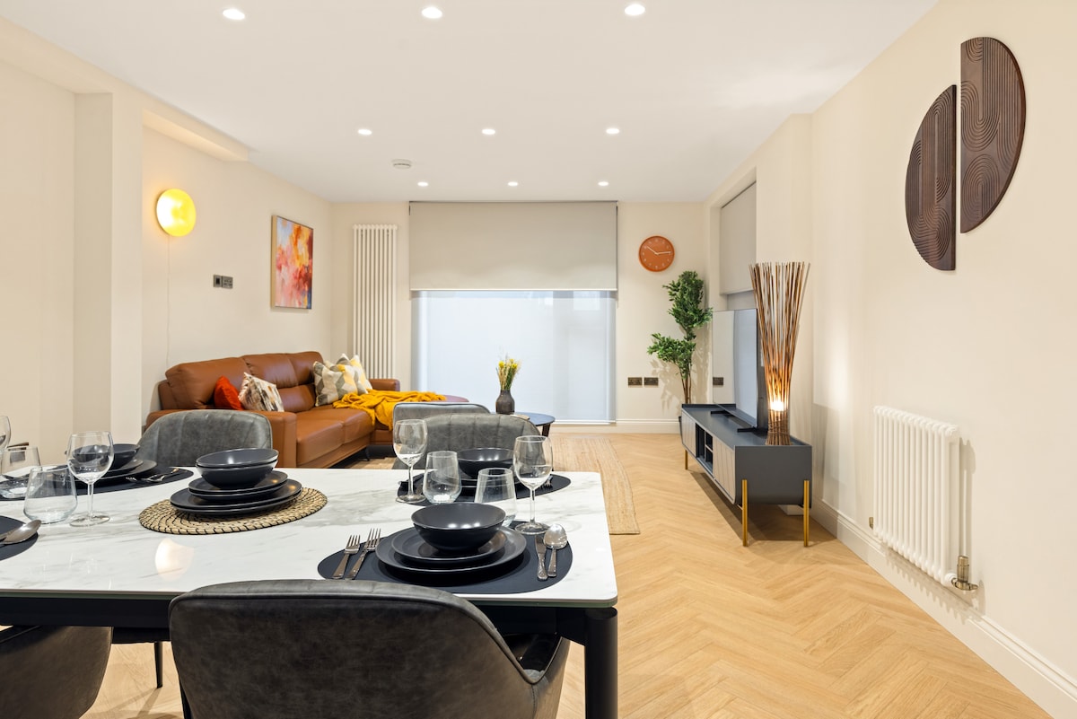 📍Questa raffinata casa a schiera di Chelsea, di 100 m², accoglie fino a 6 ospiti con un ingresso privato e splendidi pavimenti a spina di pesce. Vanta una cucina di lusso attrezzata con elettrodomestici Siemens, vetrate a tutta altezza e due tranquille camere da letto con doppi vetri e lussuosa biancheria da letto. La zona giorno soleggiata invita al relax, con Wi-Fi, Smart TV, lavatrice e lavastoviglie. Situato in posizione ideale vicino a Fulham Road, King's Road, musei e parchi lussureggianti, è un rifugio urbano perfetto