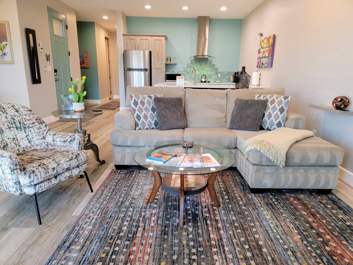Questo elegante monolocale è il luogo perfetto per allontanarsi dalla vita cittadina e vivere la pace e la tranquillità del deserto di alta montagna di Sedona. Situato in posizione ideale ai margini della città, su una superficie di oltre 2 ettari, avrai spazio per muoverti. Goditi albe e tramonti. Trascorri del tempo sotto cieli stellati e ammira la Via Lattea in tutta la sua estensione. All'interno troverai tutti i comfort: biancheria da letto di lusso, enorme TV a schermo piatto, angolo cottura rifornito (caffè incluso!), lavatrice/asciugatrice e un ampio bagno.