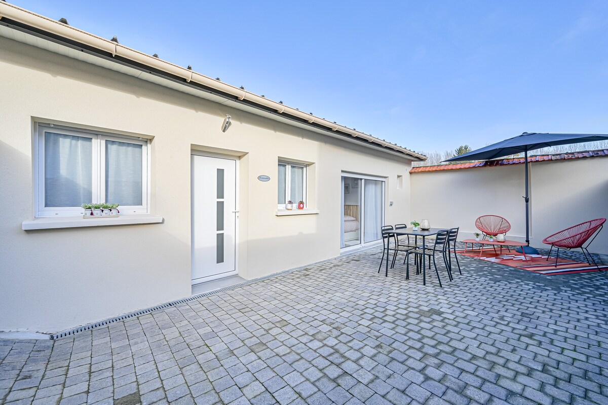 Benvenuti nella nostra dependance situata in fondo al nostro giardino. 55 mq ristrutturati con ampio soggiorno/cucina completamente attrezzata. Una camera con 1 letto matrimoniale/divano letto convertibile 2 posti nel soggiorno. Lettino pieghevole disponibile su richiesta con un supplemento di 5€. Piccola terrazza con tavolo e sedie e un piccolo pezzo di giardino. Quartiere residenziale a 2 minuti di auto da una galleria commerciale con Speed Parc, cinema, ristoranti... e a 5 minuti a piedi da una piccola foresta 🌳