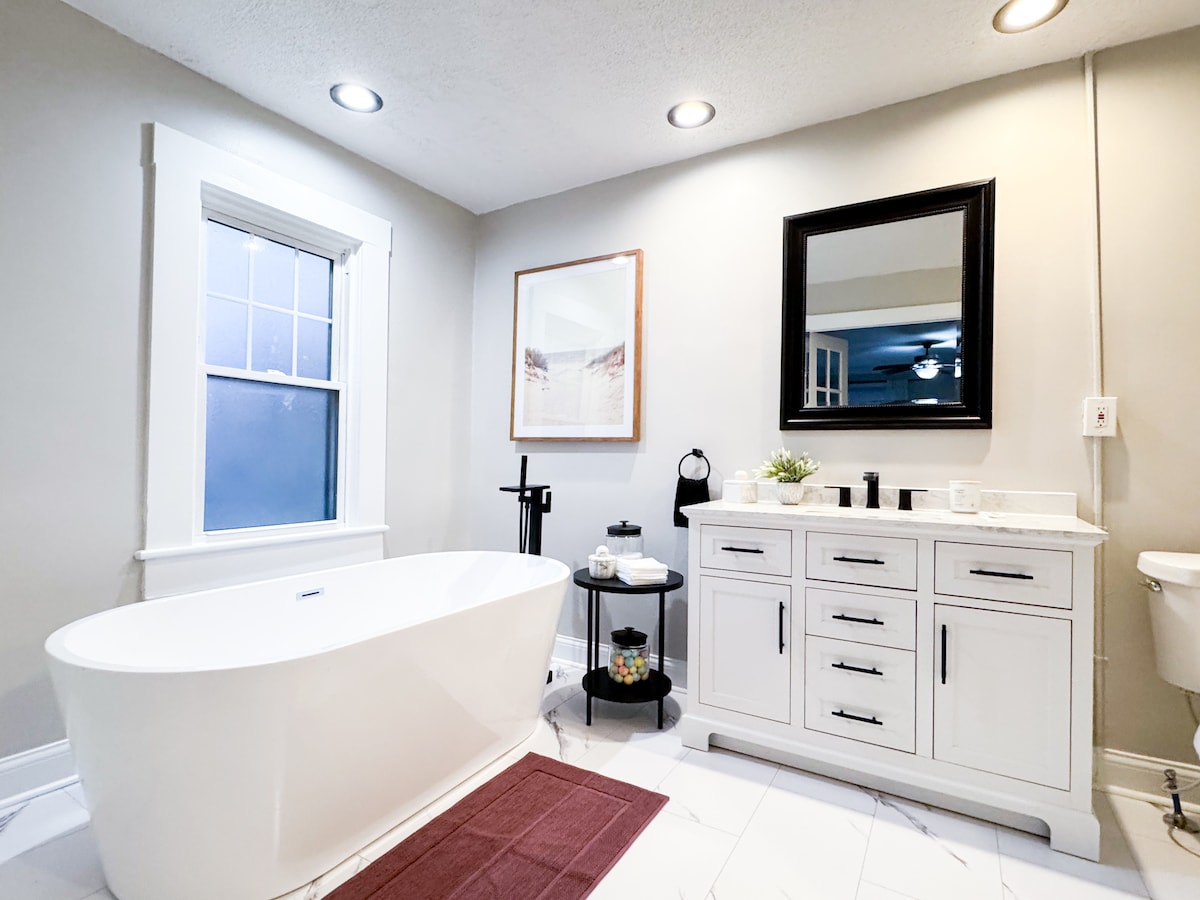 Benvenuto ad AmberTone! Fai della nostra residenza recentemente ristrutturata di 3 camere da letto, 1,5 bagni e 2300 piedi quadrati la tua casa lontano da casa, mentre torni indietro a un'epoca più semplice. Abbiamo arredato questa casa con un tocco di metà secolo e un tocco moderno, mantenendo comfort, intrattenimento, pace e sicurezza in prima linea nel nostro design. Per il vostro comfort, abbiamo 3 camere da letto con 2 letti king-size e uno queen-size, tutti con coprimaterasso che vi cullano mentre dormite. Nessun dettaglio è stato dimenticato per rendere il tuo soggiorno indimenticabile!