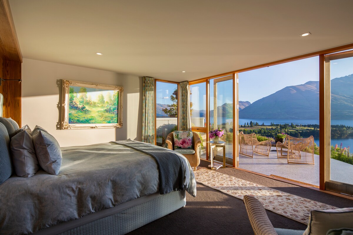 Lussuosa e spaziosa suite residenziale privata in una delle residenze contemporanee ispirate a Frank Lloyd Wright, di nuova costruzione e appartenente a Tim Wilson, uno dei più famosi artisti paesaggisti neozelandesi. Situata sulla prestigiosa collina di Queenstown, offre ampie vedute del lago Wakatipu, del Cecil Peak, del Walter Peak, della cabinovia di Queenstown e delle maestose catene montuose Remarkables.