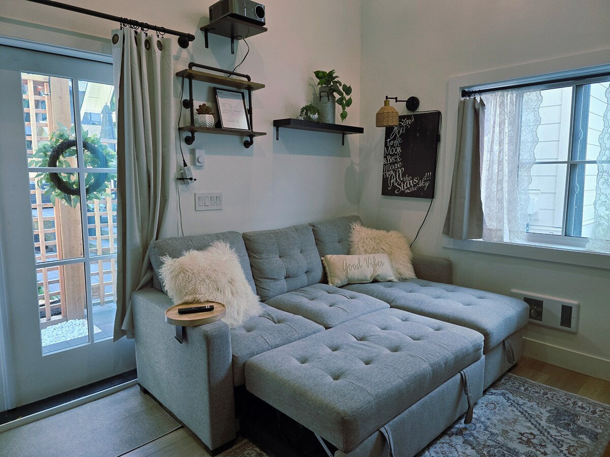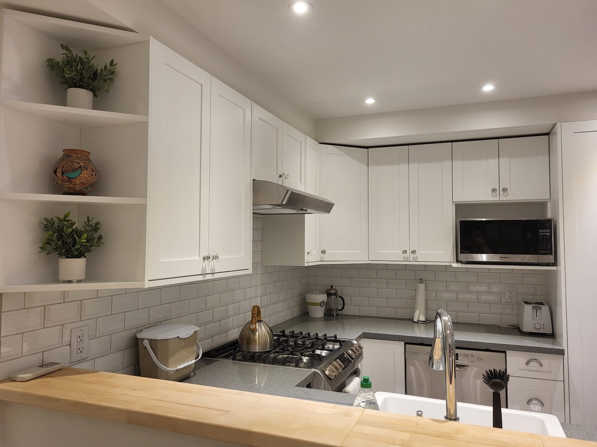 Appena ristrutturato, 56 metri quadrati di comfort luminoso e accogliente. Arredamento in stile spiaggia per farti entrare in modalità vacanza con la sensazione di essere a casa lontano da casa. Perfetto per lavoro o per piacere. Wifi 5G incluso. TV via cavo Telus, Netflix, Prime, Disney e Apple inclusi. Cucina privata completamente attrezzata con lavastoviglie. 1 camera con letto matrimoniale e materasso nuovo di lusso di alta gamma + nuovo divano letto matrimoniale nel soggiorno. Lavanderia in loco con detersivi inclusi. Parcheggio in strada ben illuminato, scale fino all'ingresso.
