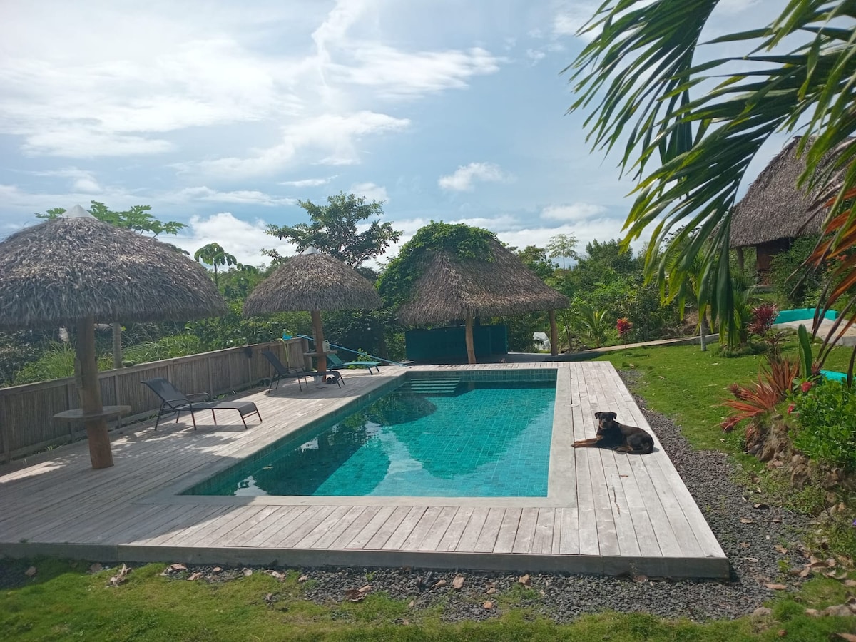Cet hébergement élégant est parfait pour les groupes ou famille jusqu'a 6 personnes. Construit entiérement en bois de teck et en penka votre suite Jungle vous promet un confort exotique. Un lit double au rez de chaussé, douche, lavabo et toilettes séparés. Deux lit double á l'étage avec ventilateur de plafond. Grande terrasse avec vue piscine.