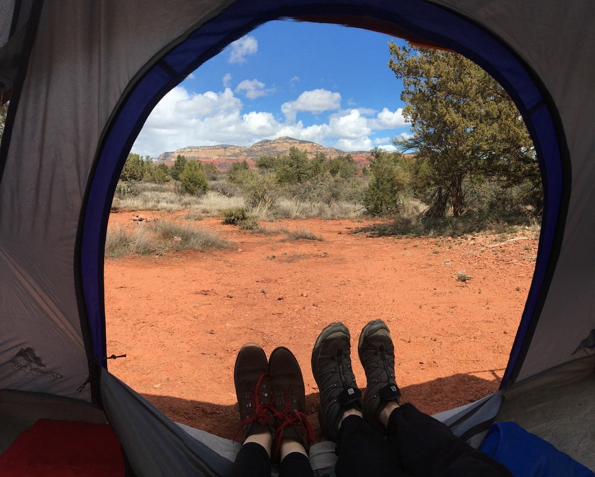 Vivi il vero campeggio nella natura selvaggia di Sedona con viste mozzafiato sulle rocce rosse. Questo annuncio include il noleggio di tende e attrezzature da campeggio per l'auto-configurazione in un'area di campeggio pubblica designata vicino a Sedona. Si tratta di un'esperienza nel deserto allo stato puro: niente bagni, niente acqua corrente, niente allacciamenti, solo natura, cieli aperti e paesaggi incredibili. Perfetto per i viaggiatori avventurosi che desiderano un'autentica esperienza di campeggio off-grid senza portare la propria attrezzatura. La tenda T4 è spaziosa, perfetta per una coppia.
