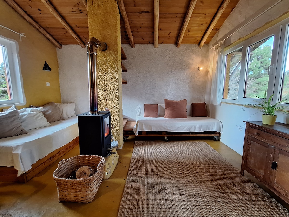 Casa independente com ampla abertura de janela para o jardim privado e vedado com acesso direto a piscina partilhada. Tem Kitchenette, área de quarto com cama de casal, cama de gavetão na sala e mezanino acessível por escada inclinada com camas adicionais. Isolada com cortiça e madeira tem chão aquecido e ventilação de ar forçado quente ou frio. É permitida a estadia de animais com taxa por estadia de 25€. A roupa de cama e toalha para o berço de bebé tem o custo adicional de 10€ por noite.