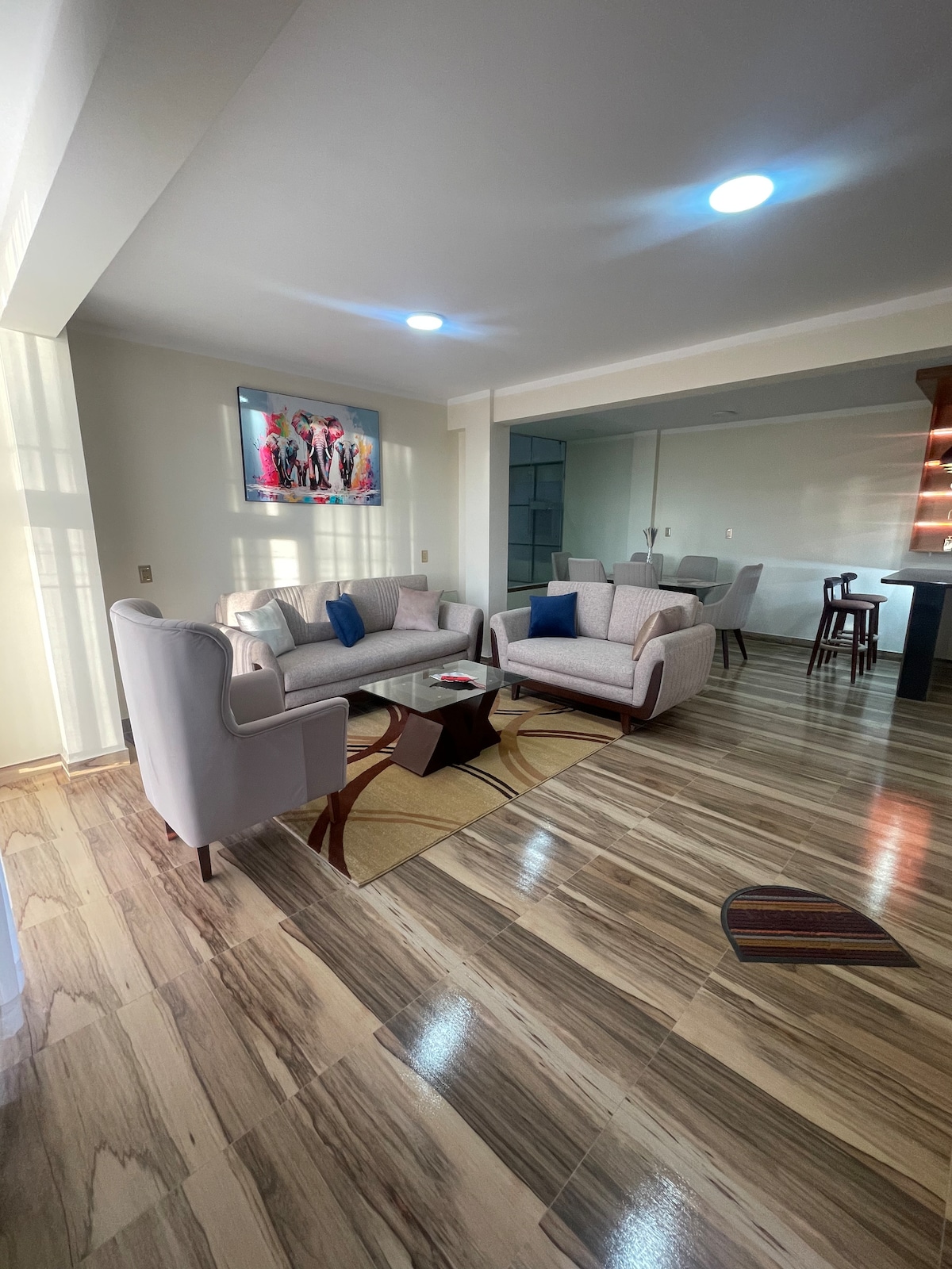 Departamento moderno y centrico en Uyuni. disfruta de la comodidad y tranquilidad de este departamento de dos cuartos y una sala con un diseño acogedor y funcional para tu estadia. dispone de una cocina americana equipada con todo lo necesario para disfrutar tus comidas.Ademas su muy buena ubicacion se encuentra cerca de una clinica privada y un doctor en planta baja. el mercado campesino de Uyuni esta a 50 metros y a 300 metros del reloj de Uyuni y sus cercanos restaurantes. Feliz estadia!