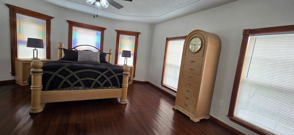 POSIZIONE ECCEZIONALE! Questa casa artigianale ristrutturata dispone di 2 letti king-size e un letto a castello completo/doppio in 3 camere da letto separate, 2 bagni completi, una zona giorno confortevole e una cucina ben fornita. Molte finestre in tutta la casa lasciano entrare molta luce naturale, mentre le tende oscuranti nelle camere da letto offrono una privacy completa. I posti a sedere sulla veranda anteriore offrono uno spazio accogliente e invitante dove gli ospiti possono rilassarsi in un quartiere tranquillo. Hai trovato l'alloggio perfetto al Texas Breeze Bunkhouse!