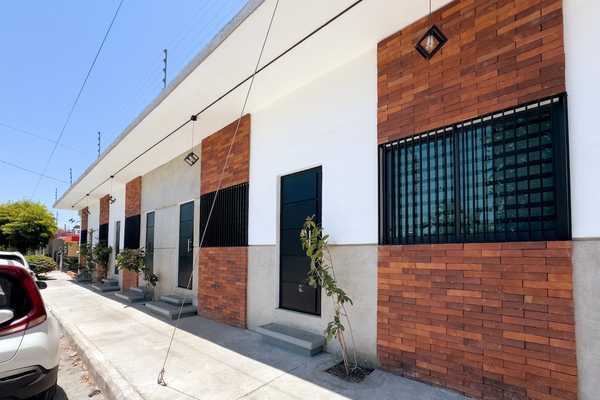 🏡 Suite al piano terra | Ideale per coppie o viaggiatori soli. Dispone di letto king-size, aria condizionata, angolo cottura attrezzato, bagno completo, soggiorno e terrazza privata. Parcheggio all'interno dell'edificio. Ottima posizione sul viale. Camino Real, vicino all'Università di Colima, uffici governativi, ospedali e aree commerciali. Comodo, pratico e perfetto per riposare o lavorare. Che si tratti di una notte o di un soggiorno prolungato, qui troverai il riposo di cui hai bisogno.