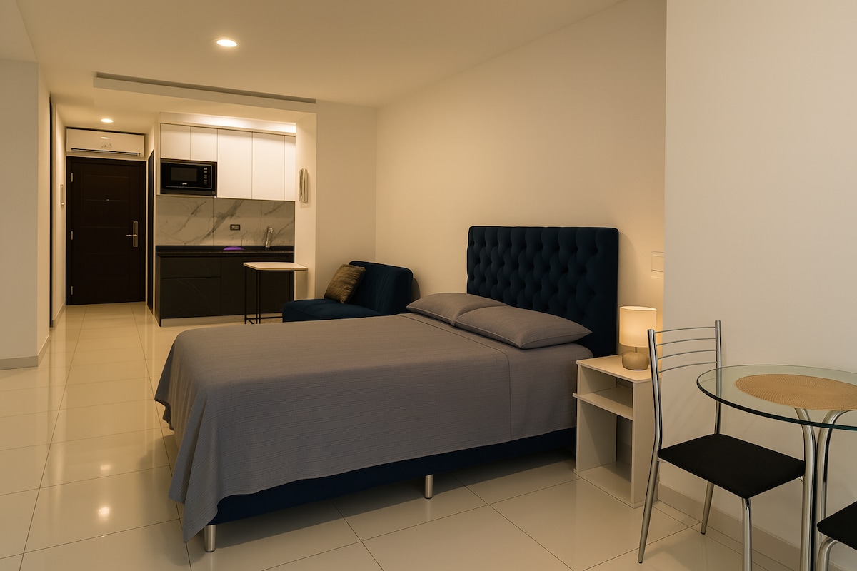 Monolocale decorato e arredato con uno stile chic in SMART YOU, Equipetrol. Offre un letto comodo, Smart TV, divano letto, scrivania e cucina attrezzata pronta per preparare i tuoi pasti preferiti. Il balcone si affaccia su Manzana 40. Goditi le sue aree comuni: piscina, coworking, barbecue, sala riunioni, lavanderia e orto. Sicurezza 24 ore su 24, 7 giorni su 7 in un quartiere vivace, vicino a ristoranti, negozi, centri commerciali e di intrattenimento a Santa Cruz.