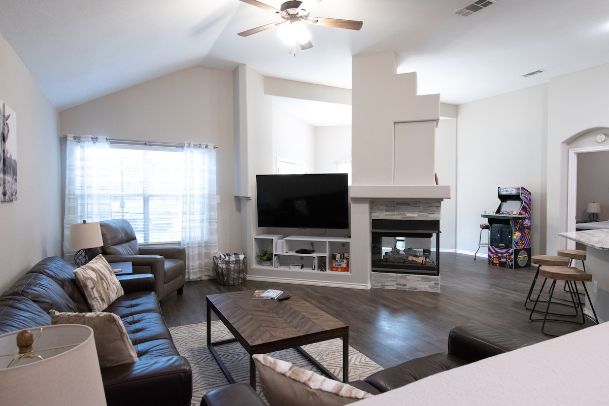 Ti diamo il benvenuto nel nostro lussuoso alloggio Airbnb per famiglie! La nostra casa offre tutti i servizi necessari per un soggiorno confortevole e piacevole con i tuoi cari. Guarda film e programmi TV sull'enorme schermo da 85 pollici, rilassati nella vasca idromassaggio o gioca nel cortile erboso. Abbiamo anche un accogliente angolo lettura per momenti di tranquillità. Situato vicino a Legacy West, The Star, RoughRiders Baseball e molti centri commerciali, non rimarrai mai a corto di cose da fare. Prenota subito il tuo soggiorno e inizia a pianificare la vacanza perfetta!
