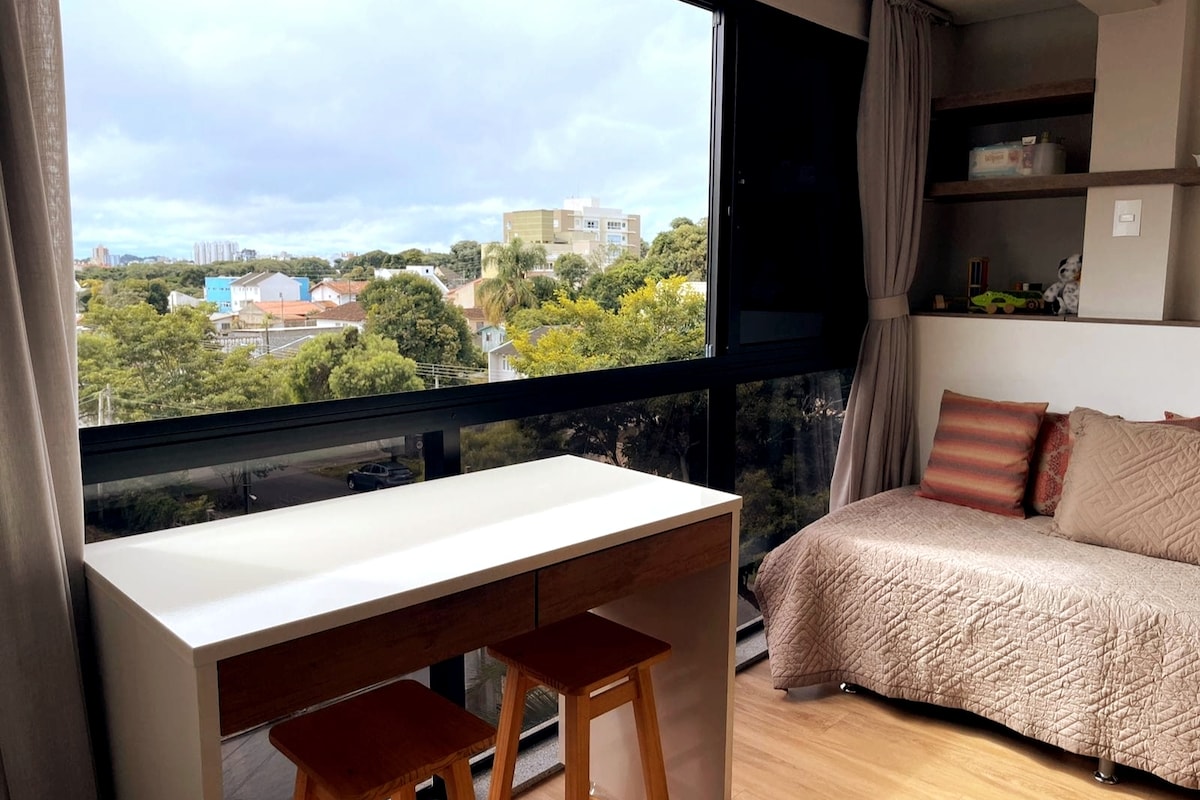 Se vieni a Curitiba per lavoro o hai bisogno di un alloggio pronto per lunghi soggiorni, questo monolocale è stato preparato per offrire praticità, sicurezza e una routine leggera. Differenziali: abbiamo il supporto di un addetto alle pulizie con cambio della biancheria da letto/da bagno di base e pulizia rapida ogni 15 giorni di soggiorno, effettuata dalla governante (entrambi su richiesta senza alcun costo) e altri servizi in loco. NUOVO monolocale di 20 m² con bagno privato, arredi su misura e cucina compatta completa.