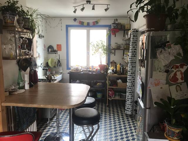 Appartamento molto luminoso fino a 9 posti letto al 1° piano di una casa con un parcheggio molto grande per diversi veicoli o macchine edili. Possibilità di godere di una parte del giardino con tavolo, sedie e barbecue. Situato a soli 5 minuti di auto o 5 minuti a piedi dalla metropolitana Balma Gramont e dal centro commerciale Auchan. Con la metropolitana, in 10 minuti e per 2€ siete in Place du Capitole (6 stazioni)! nel cuore di Tolosa. L'appartamento ha un ingresso indipendente.