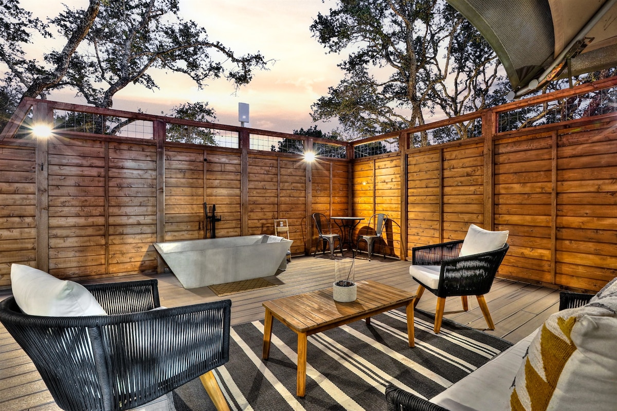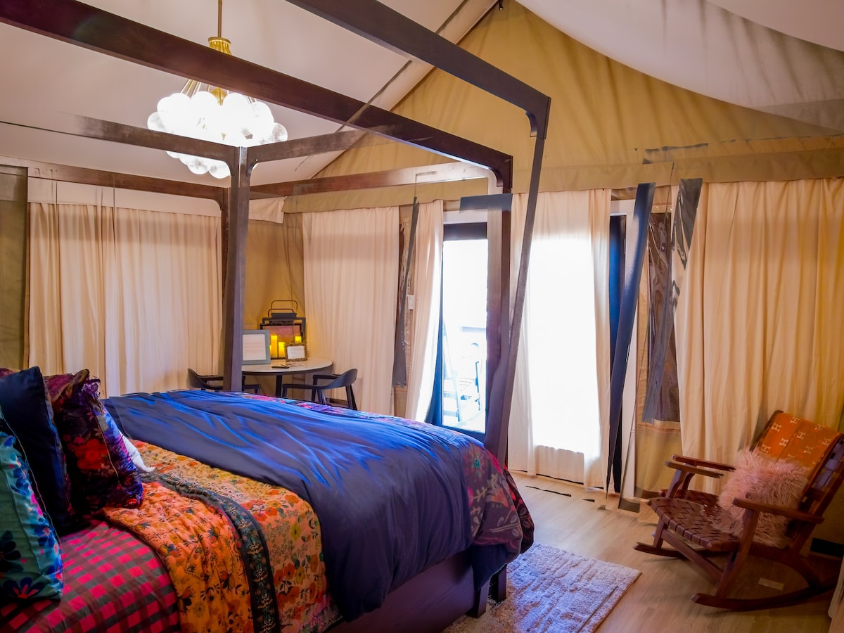Rifugiati nel McClenton Hideout, dove il fascino della campagna incontra il lusso in una tenda da safari con letto matrimoniale grande, vasca da bagno e braciere sotto le stelle del Texas. Goditi il comfort di un hotel, sorseggia champagne sulla terrazza o vivi un'avventura con giri in quad e panorami naturali. Esplorate il centro storico di Bastrop con i suoi negozi, i suoi locali di liquori e i suoi birrifici, oppure fate un giro in kayak sul fiume Colorado, a soli 30 miglia a est di Austin sulla Hwy 71.Perfetto per relax, romanticismo o avventure all'aria aperta.