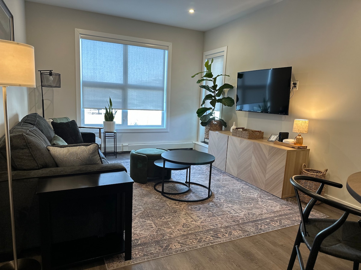 Questo nuovissimo appartamento con due camere da letto è inondato di luce naturale, ha una vista eccezionale sulle montagne e si affaccia sul fiume. Spazio aperto contemporaneo, un luogo artistico e accogliente che può ospitare fino a 4 persone ed è ideale per coppie o famiglie. Situato in posizione centrale, sei a pochi passi dai tuoi caffè, negozi e ristoranti preferiti. Sei a pochi minuti dalla collina sciistica e dalle piste ciclabili Moonraker/CBT, e proprio sulla strada del fiume. Numero di registrazione provinciale H391623453