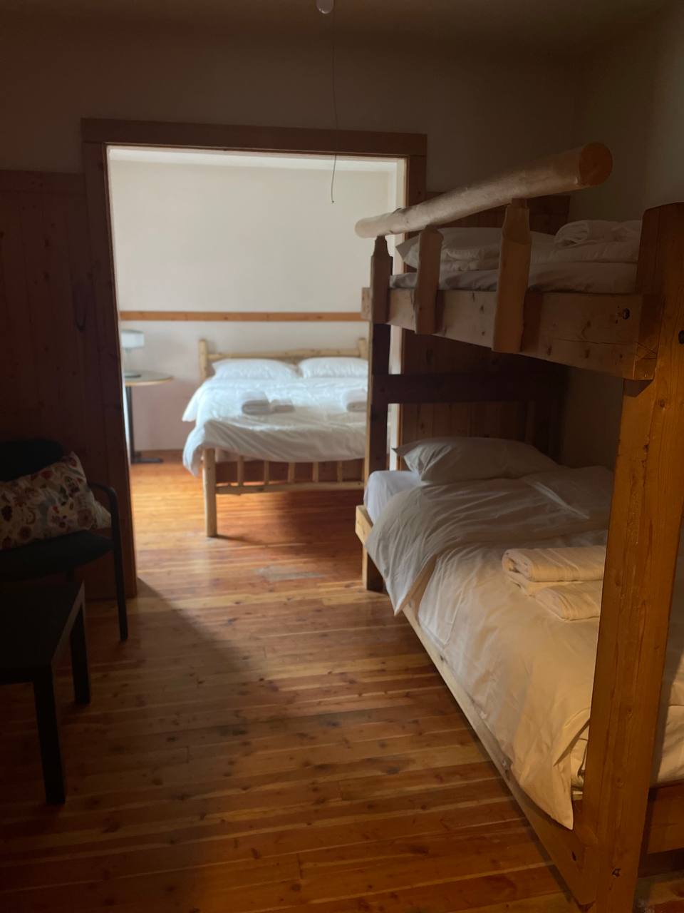 Camera classica del lodge con pavimenti in legno e telai dei letti realizzati a mano.