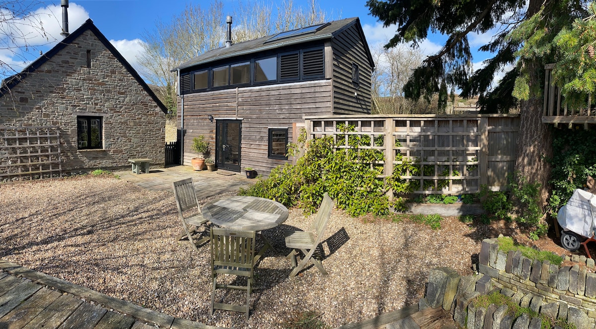 Oak beams and wooden floors frame a simple whitewashed open plan space which offers: a sleeping area on the mezzanine with one double floor-level bed and up to two single futons; on the ground floor, a wet-room and the kitchen-eating-living area with Clearview wood-burning stove. Located at the foot of The Offa's Dyke Path and only a 5 minute walk to shops, pubs, park with river access. Wireless. Off road parking. Well behaved dogs welcome. Can accommodate 2 adults and up to 2 children.