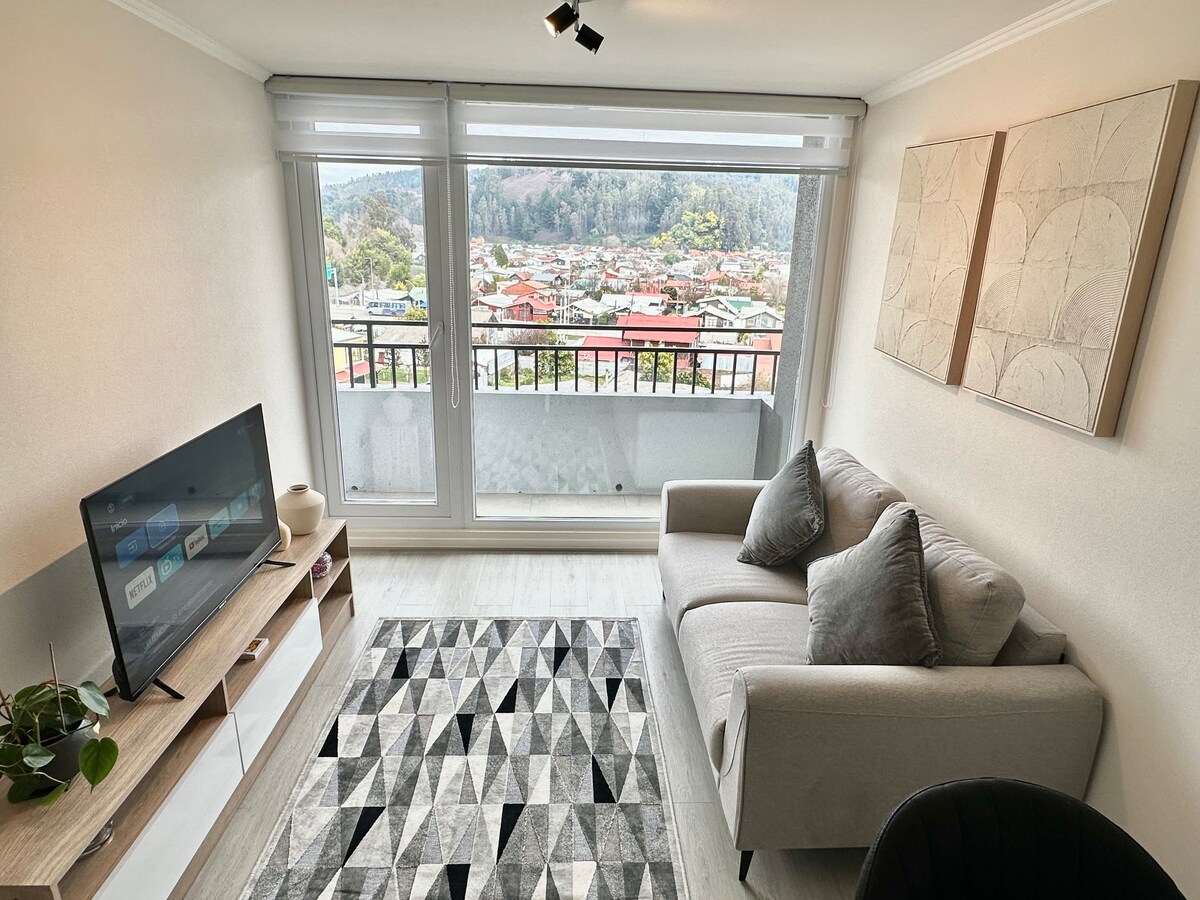 Moderno appartamento completamente attrezzato con una splendida vista sul fiume Andalien, ideale per un soggiorno tranquillo, confortevole e sicuro. Posizione privilegiata in Av. Collao, a pochi isolati dal Bus Terminal, dallo Stadio, dalla Bio University, dal Supermercato e a pochi passi dalla locomozione collettiva. Dispone di concierge 24 ore su 24, 3 ascensori. Netflix, Disney+, Amazon ecc. App a pagamento disponibili, per gli account di accesso degli utenti