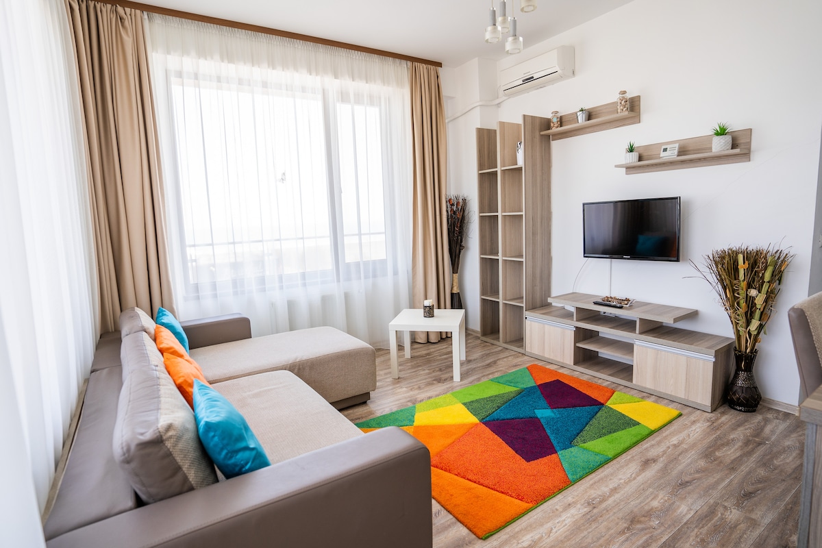 Rilassati in questo spazio calmo ed elegante. Scegli di trascorrere un soggiorno da sogno sulla riva del Mar Nero, in un appartamento spazioso e completamente attrezzato con note marine che ti offrono un grande comfort e un fantastico panorama sul Lago di Ovidiu e sul mare !Le vivaci spiagge di campi da pallavolo, piste da ballo e sport acquatici distano 500 m, nelle immediate vicinanze ci sono supermercati, ristoranti e locali, vi auguriamo relax e piacevole divertimento!