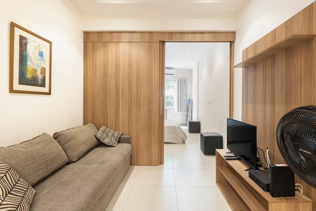 Bellissimo appartamento con una camera da letto recentemente ristrutturato a pochi passi dalla spiaggia di Copacabana. Arredamento moderno, soggiorno con divano e TV a schermo piatto. Scrivania con sedia. Letto matrimoniale, divano letto matrimoniale, aria condizionata, TV via cavo, Internet ad alta velocità, Wi-Fi, cucina completamente attrezzata con fornelli, microonde, frigorifero e utensili da cucina. Vicino a negozi, ristoranti e all'hotel Marriott. Portiere di sicurezza 24 ore su 24. Orari di check-in e check-out flessibili.