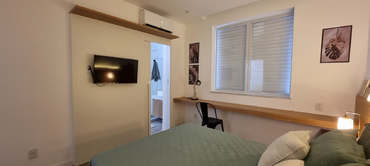 -FLAT top reformado Possb.Garagem -DESCONTO especial reservas c antecip+60 dias Pmin.10 dias PRAIA/METRÔ+-180m Checkin/checkout flexível p1/2 diária-cada sob consulta -Guarda Bagagem grátis p/peq volume -Wi-Fi Potente/Area Trabalho -Varanda -Banheiro grande chuveiro bom -Cama Madeira maciça -2 Sofás CamaCasal bons - TV Smart Samsung -Ar Cond -2 Vent. deTeto -Máq.Lavar -CozinhaGrande -PISCINA -SAUNA -ACADEMIA -Mercadinho24h -LavanderiaSelf-service24h -CarregVeicular -Serviço básico arrumação