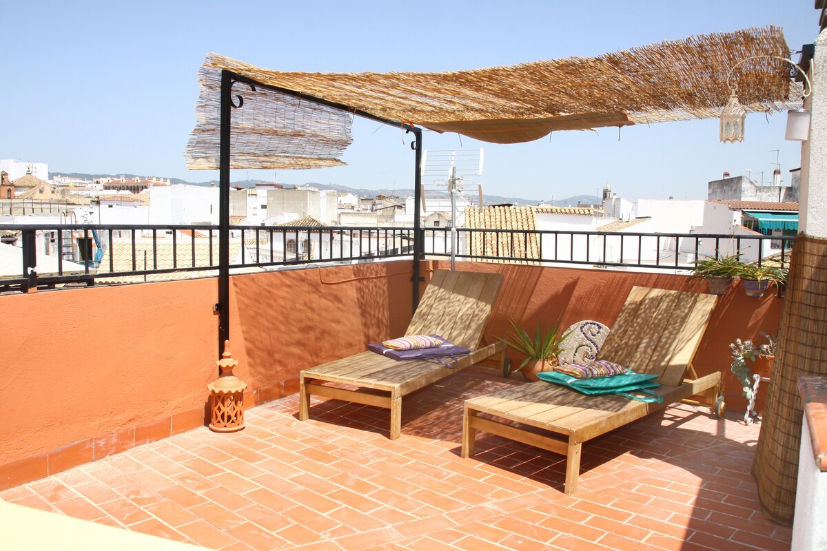 Casa unifamiliare molto ben posizionata nel centro storico e molto luminosa, con solarium, perfetta per famiglie di 4 persone, vicina a interessi, ristoranti, bar, negozi di alimentari e forno... Vista sui tetti del centro storico, vicino al guadalquivir (fiume), si può dormire sotto le stelle attraverso il lucernario sul letto matrimoniale. Recente ristrutturazione con artigiani (ferro, piastrelle ...) e le mie creazioni. Parcheggio gratuito dall'altra parte del fiume e a pagamento nel parcheggio Ribera.