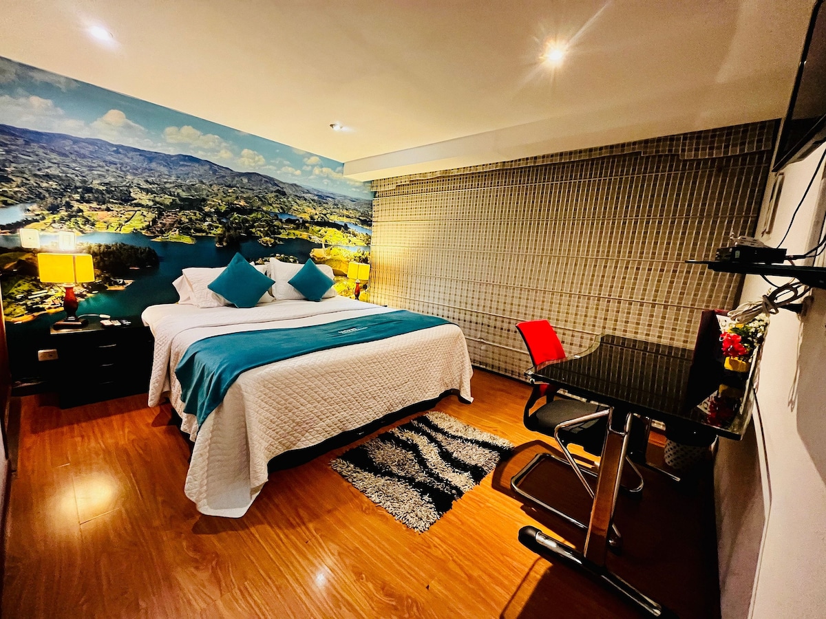 *Habitación SENC CAMA QUENN *Baño con agua caliente *TV cable *Wiffi *Desayuno Tipo Americano *Hora Check in: 3:00 pm *Hora Check out : 1:00 pm -Ubicacion: *Ubicados a una cuadra de la Embajada Americana , de Salon de eventos Corferias, del Centro de convenciones Agora , a 20 minuts del aeropuerto y 12 minutos del terminal de transporte Salitre -Parking: *Contamos con 3 cupos de PARQUEADERO GRATUITO va sujeto a disponibilidad del dia se debe consultar disponibilidad parqueadero.