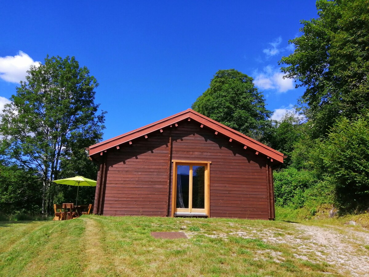 Grazioso chalet recente, Tutto in legno, accogliente, caldo. Su grande terreno 2500 m2 senza dirimpettai. 1,5 km dal centro. Grande terrazza 70 m2, vasca idromassaggio esterna coperta 4- 6 persone riscaldamento a pavimento, stufa a pellet, grande doccia 140. letti 140 e 160 + angolo bambini letto per bambini + Piccolo chalet, capanna per bambini, o notte insolita, o parcheggiare le 2 ruote in sicurezza