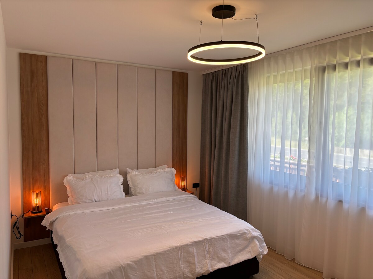 Abbiamo creato uno spazio per persone speciali🥰❤️ Elegante, raffinato e completamente attrezzato per un soggiorno indimenticabile con la persona amata. L'appartamento dispone di 2 camere ed è suddiviso: 1 camera da letto, cucina, soggiorno, sauna, bagno, giardino. La struttura dispone di un gazebo attrezzato con barbecue, forno, piano cottura, zona pranzo interna o esterna. Situato a 8 km dal centro di Brasov, vicino a Poiana Brasov, alle aree sciistiche di Predeal, al castello di Peles, a Bran, al parco avventura/paradiso acquatico