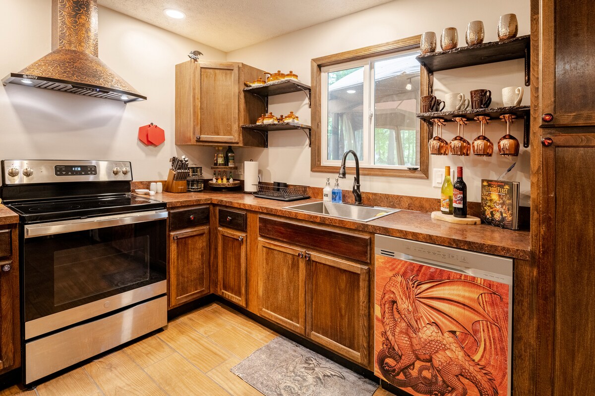 Crea ricordi magici in questa casa a tema drago! Raduna i tuoi amici, compresi quelli pelosi, e organizza una fuga a tema Fiera rinascimentale o un soggiorno romantico da re. Gioca a mini golf: 3 tee pitch & putt proprio nella proprietà! Accoccolati vicino al focolare o siediti attorno a un camino a legna, Immergiti nella vasca idromassaggio interna per due mentre ammiri un camino a parete nella Dragon Liar o rilassati in una vasca idromassaggio all'aperto per quattro; osserva un giardino di pietra dalla Royal Chamber o soggiorna nella camera da letto Enchanted Forest