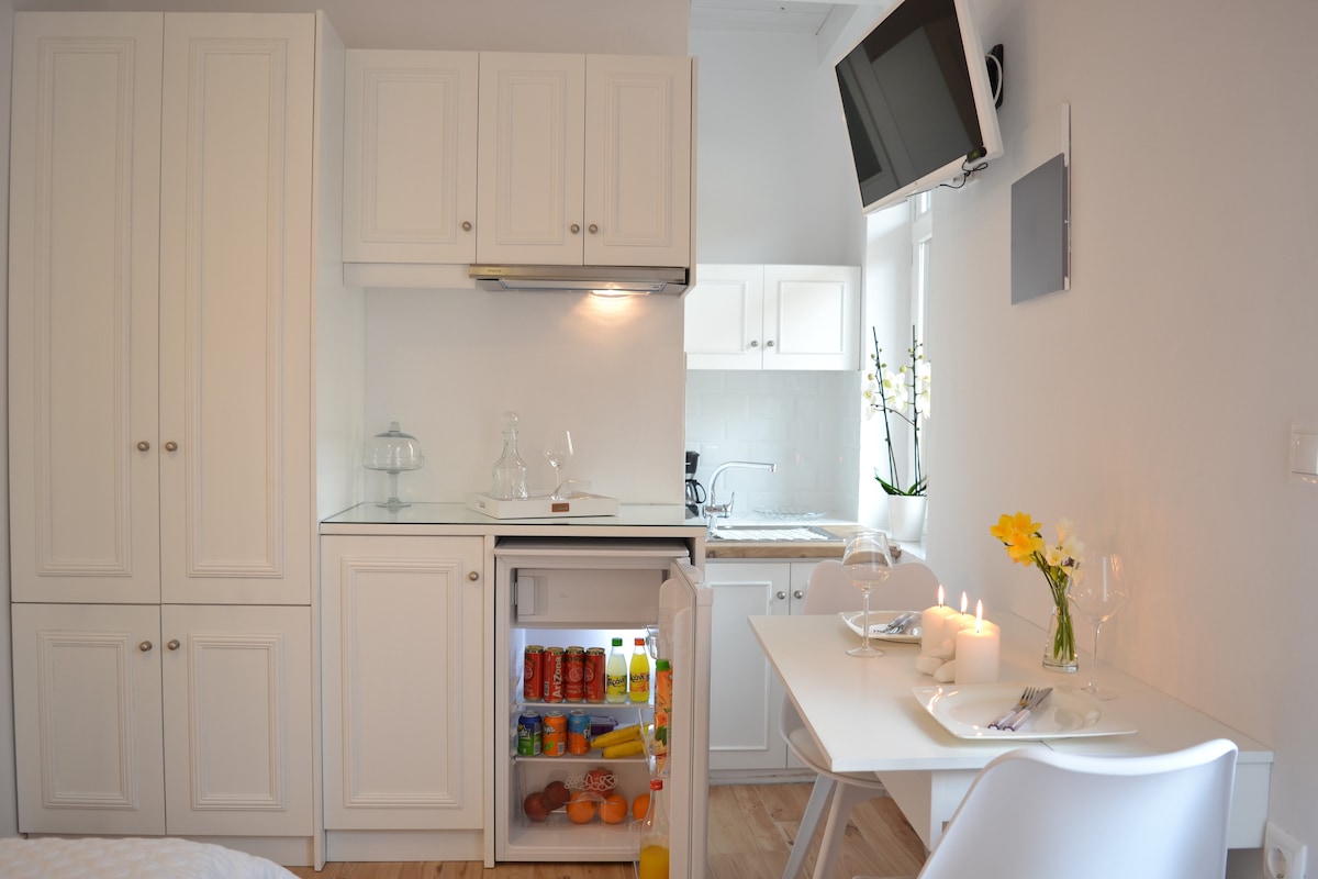 La nostra accogliente pensione con giardino è perfetta per coppie, viaggiatori solitari o lavoratori a distanza. - Appartamento open space con 1 camera da letto con letto queen size - Angolo cottura ben attrezzato - Bagno privato con cabina doccia - Wi-Fi veloce e scrivania per lavorare da remoto - Riscaldamento e aria condizionata - Ingresso privato e patio esterno - Privacy totale dalla casa principale È la prima volta che ospitiamo su Airbnb! Viviamo proprio sopra e siamo felici di offrire consigli o aiuto se hai bisogno di qualcosa, ma rispettiamo la tua privacy!