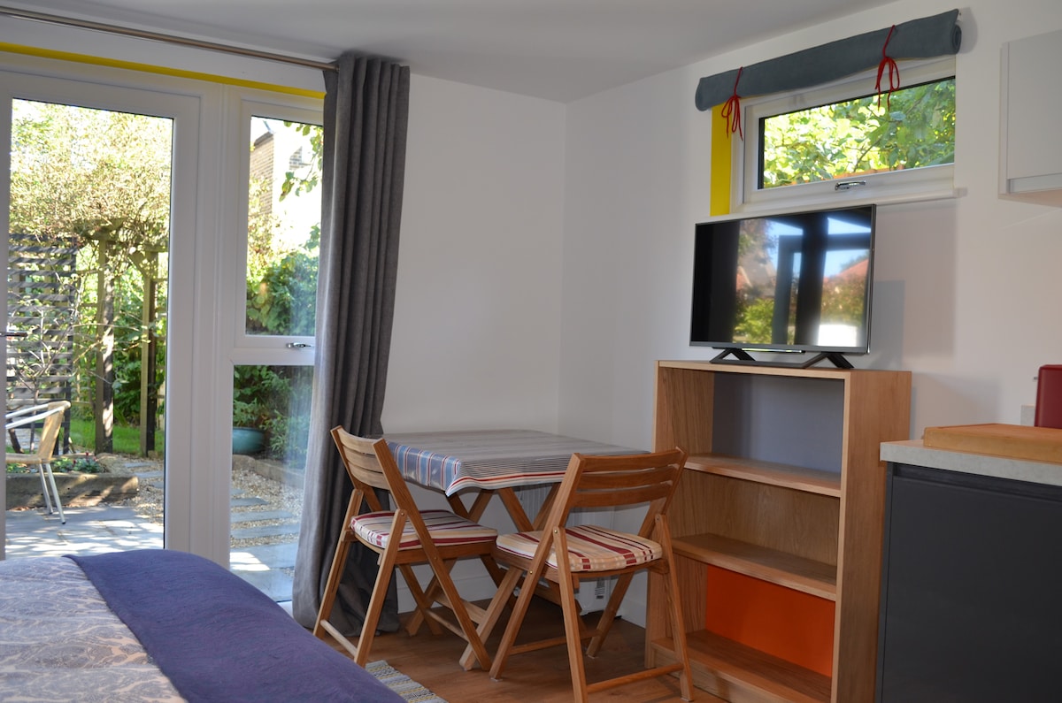 Siamo una baita indipendente tranquilla, moderna, minimalista e a zero emissioni di carbonio. Molto privato, molto sicuro, nascosto, circondato da alberi, piante, uccelli e natura: penserai di essere in campagna. Dispone di giardino e ingresso privati. La baita è costruita in larice a crescita lenta e dispone di porte con triplo vetro. L'interno è arredato con materiali sostenibili, come pannelli in compensato di betulla e pavimenti a base vegetale, e disponiamo di un sistema di aria pulita MVHR. Raccogliamo l'acqua piovana, il compost e l'energia da ASHP.