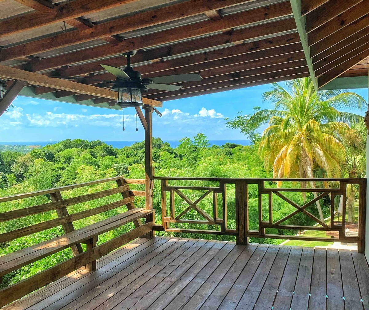 La casa dispone di un generatore automatico! Rilassati e goditi la serenità che questa casa in cima alla montagna ha da offrire. Questa villa calda e accogliente offre una vista spettacolare a 360 gradi. Goditi i tramonti mozzafiato e la vista sull'oceano dalle verande. La casa è spaziosa con un concetto aperto con nuova aria condizionata in tutta la casa. Il piano principale ha una camera da letto con letto matrimoniale grande e un divano letto estraibile in soggiorno. Ci sono 2 camere da letto al piano inferiore, ognuna con letto matrimoniale e divano letto singolo. La villa dista pochi minuti in auto dalla spiaggia