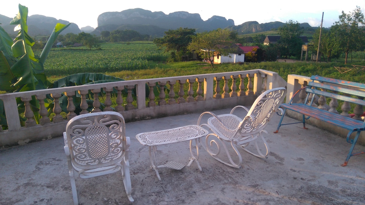 NON CERCATE OLTRE, AVETE TROVATO IL PARADISO. UN ALLOGGIO CASA CAMPO UNICO, CON CAMERA PRIVATA. UN AMBIENTE TROPICALE E UN AMBIENTE FAMILIARE CHE VI FARÀ SENTIRE COME SE FOSTE NELLA VOSTRA CASA PRIVATA. VISTA SULLA VALLE DA TUTTI GLI ANGOLI DELLA TERRAZZA. TUTTI I TIPI DI ESPERIENZE IDEALI PER FARE ESCURSIONI A CAVALLO O A PIEDI ATTRAVERSO LA VALLE DI VIÑALES, VIAGGI NELLE NOSTRE SPIAGGE, TOUR IN BICICLETTA, COLAZIONI, CENE, RUM, TABACCO E BEVANDE TRADIZIONALI.