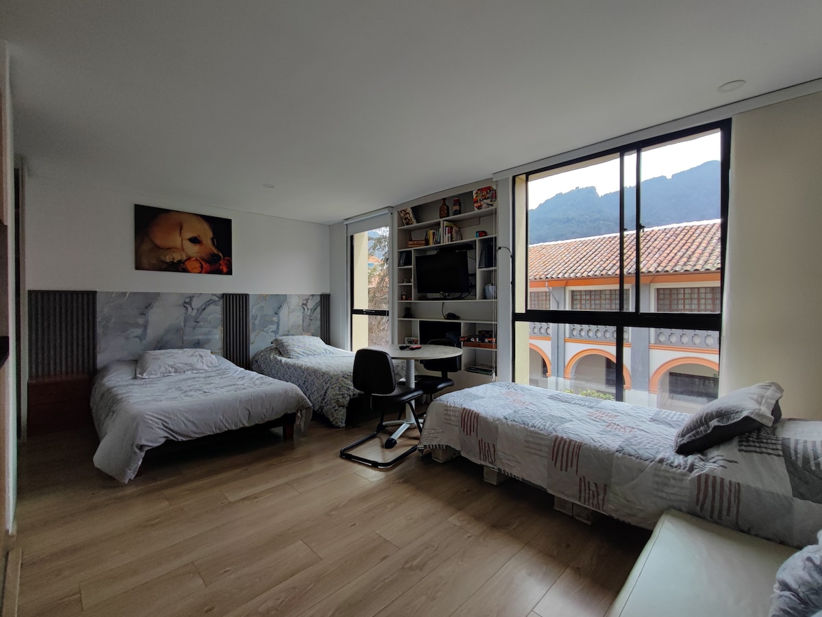 Spettacolare Mini Studio con la vista più incredibile di Bogotá. Un luogo magico, autentico, tranquillo, pulito, confortevole e accogliente. Perfetto per i viaggiatori romantici, gli amanti dei tramonti e che apprezzano l'accesso al miglior ostello di Bogotá proprio di fronte durante il loro soggiorno, con tutti i servizi dell'ostello, yoga, lezioni di salsa, bar, ristorante e ottime informazioni turistiche. Si trova al 5° piano, quindi la vista è spettacolare, senza ascensore.