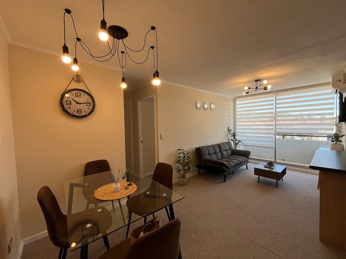¡Bienvenido/a! Nuestro acogedor depto. está completamente equipado para una estadía tranquila y confortable. Ubicados en sector residencial con excelente conectividad a carreteras. A solo 10 min. del centro; con supermercados y farmacias cercanas. Pensado para Familias que buscan seguridad y Empresas (¡Emitimos factura!). Disfruta de seguridad 24h y estacionamiento asignado. Como anfitriones experimentados, contamos con otra propiedad disponible en la zona (visita mi perfil para conocerla).